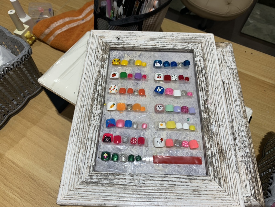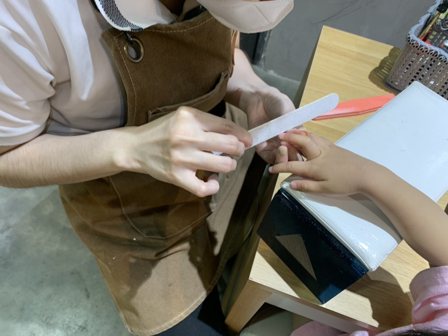 발케어 받는 좌석은 좌우로 5개씩 총 10좌석이 있어보였다. 그리고 네일에 관련된 정체모를 이름모를 기구들과 디자인샘플이 보였고 한 켠에 귀여운 꼬마아가씨가 케어를 받고 있다. 너무 귀여워서 한컷!