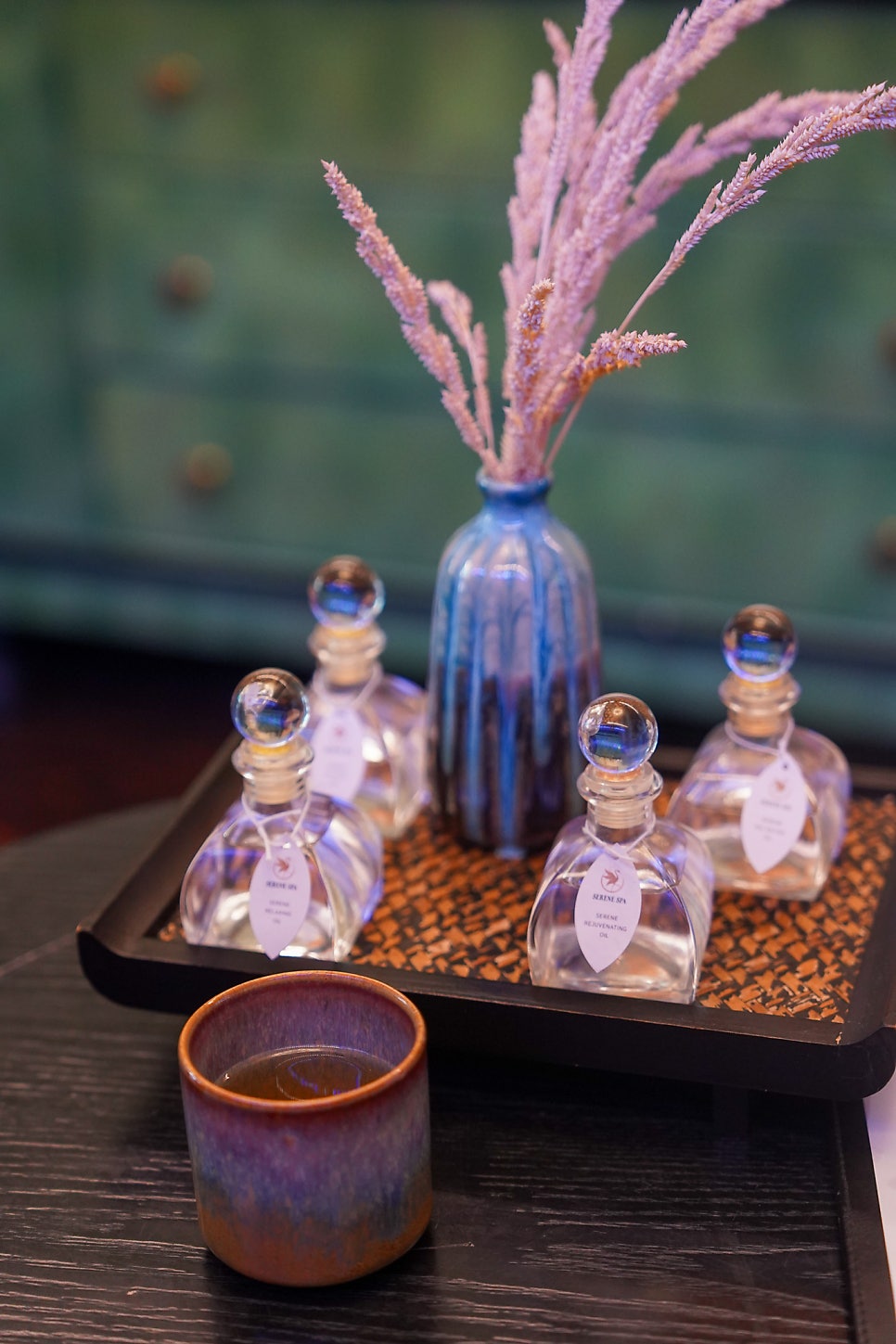 처음 서빙된 차, 과자, 그리고 물수건. 천천히 마시면서 오일도 시향해보고.