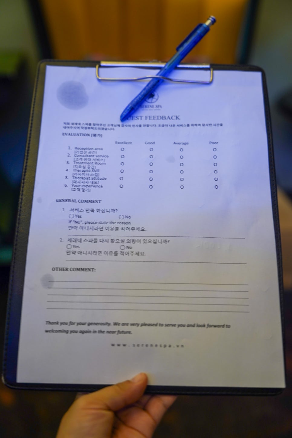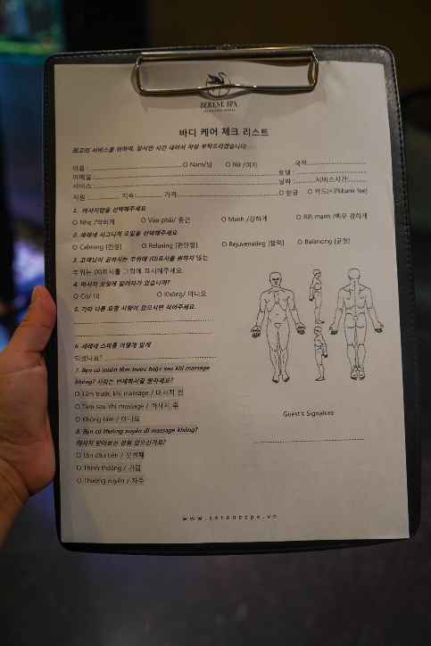 한글 버전으로 체크할 수 있어서 편하게 썼다. 오일은 향이 강하지 않고 매우 부드러워서 어떤걸 골라도 잘 받았을 것 같은데, 나는 릴렉싱 향으로 골랐음. 마사지 압의 경우 처음에는 '강하게'를 체크했는데, 내가 받는 마사지는 중간압으로 받아야 한다고 해서 변경했다. 내가 이용한 135분 패키지 상품에서 마사지 압을 강한 것으로 바꾸면, 약간의 추가 비용을 지불해야 한다고 하길래. 강한 압을 좋아하시는 분들은 상품을 바꾸거나 아니면 예약할때 일반 마사지 상품에서 심층 근육 치료ㅋㅋ 라고 번역되어 있는 딥티슈 마사지를 받는 게 맞을 것. 사실 머 그간 경험에 의하면 진짜 잘하는데서 받으면 쎄게 안받아도 충분히 좋긴 하더라.