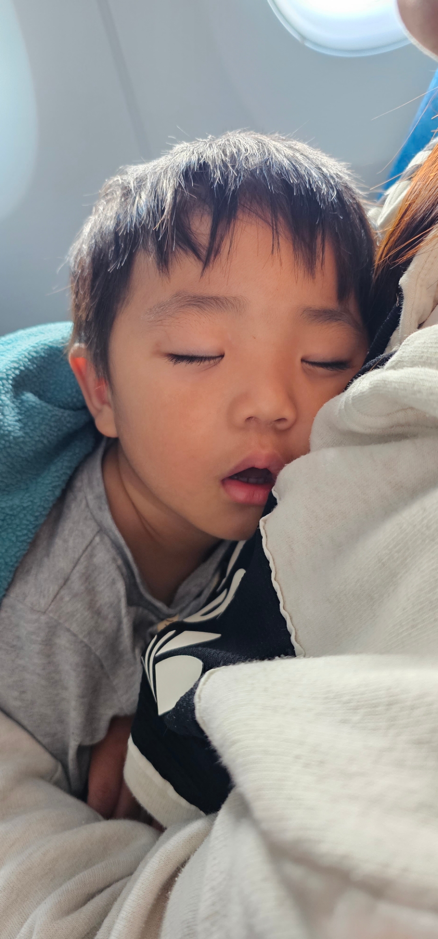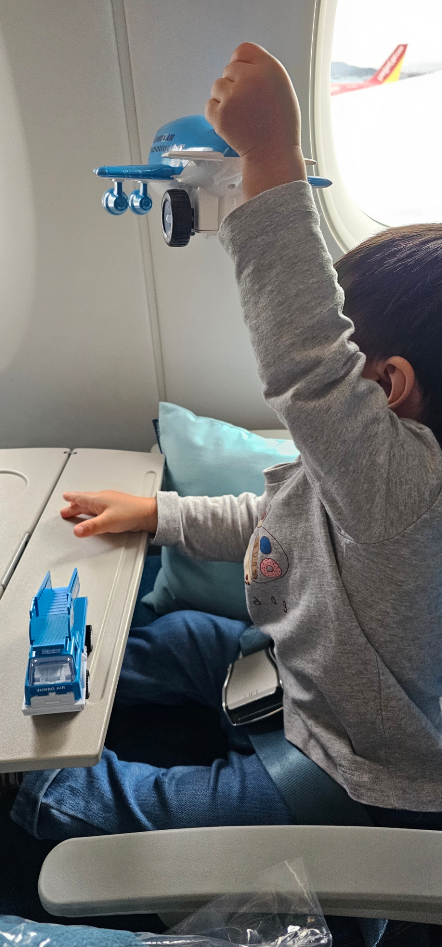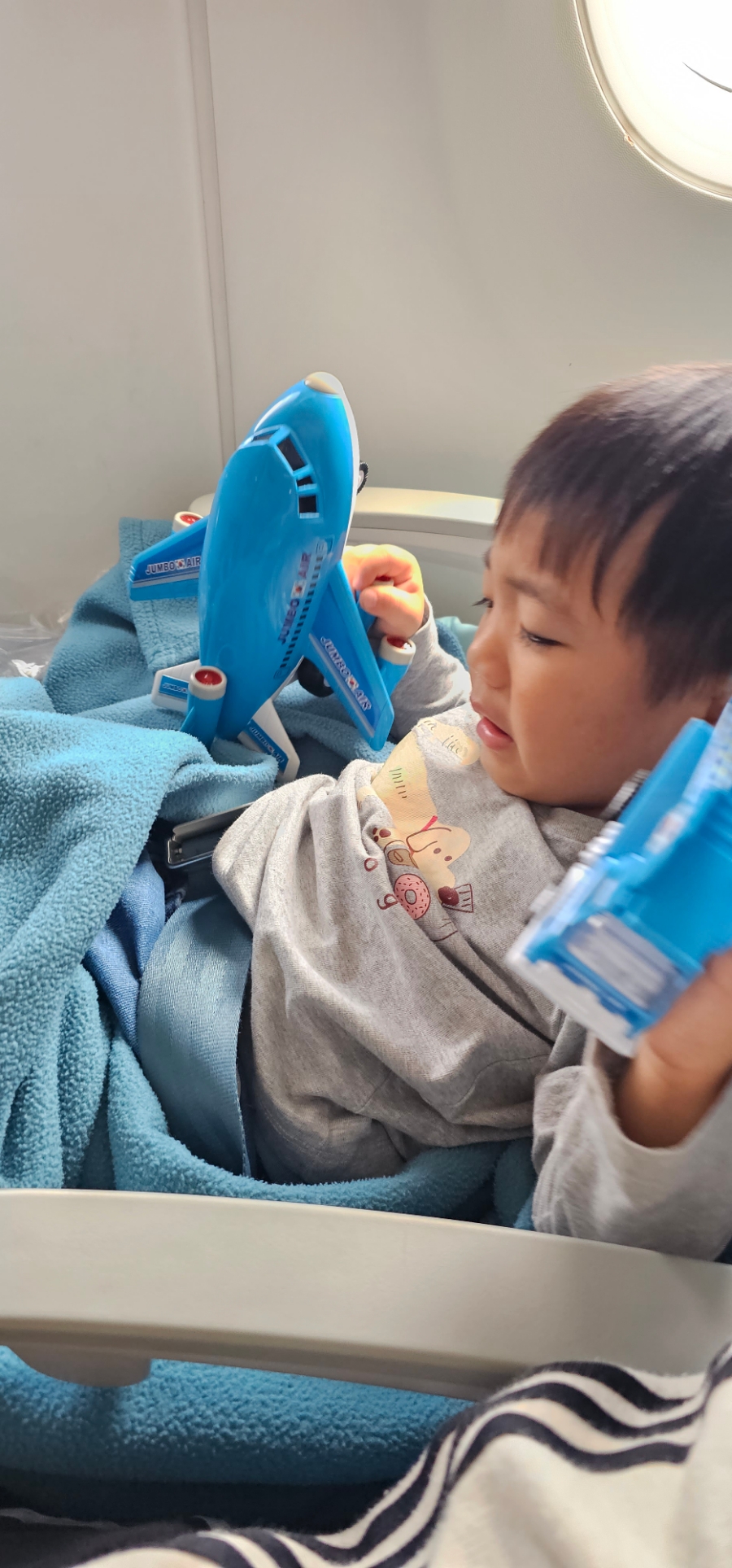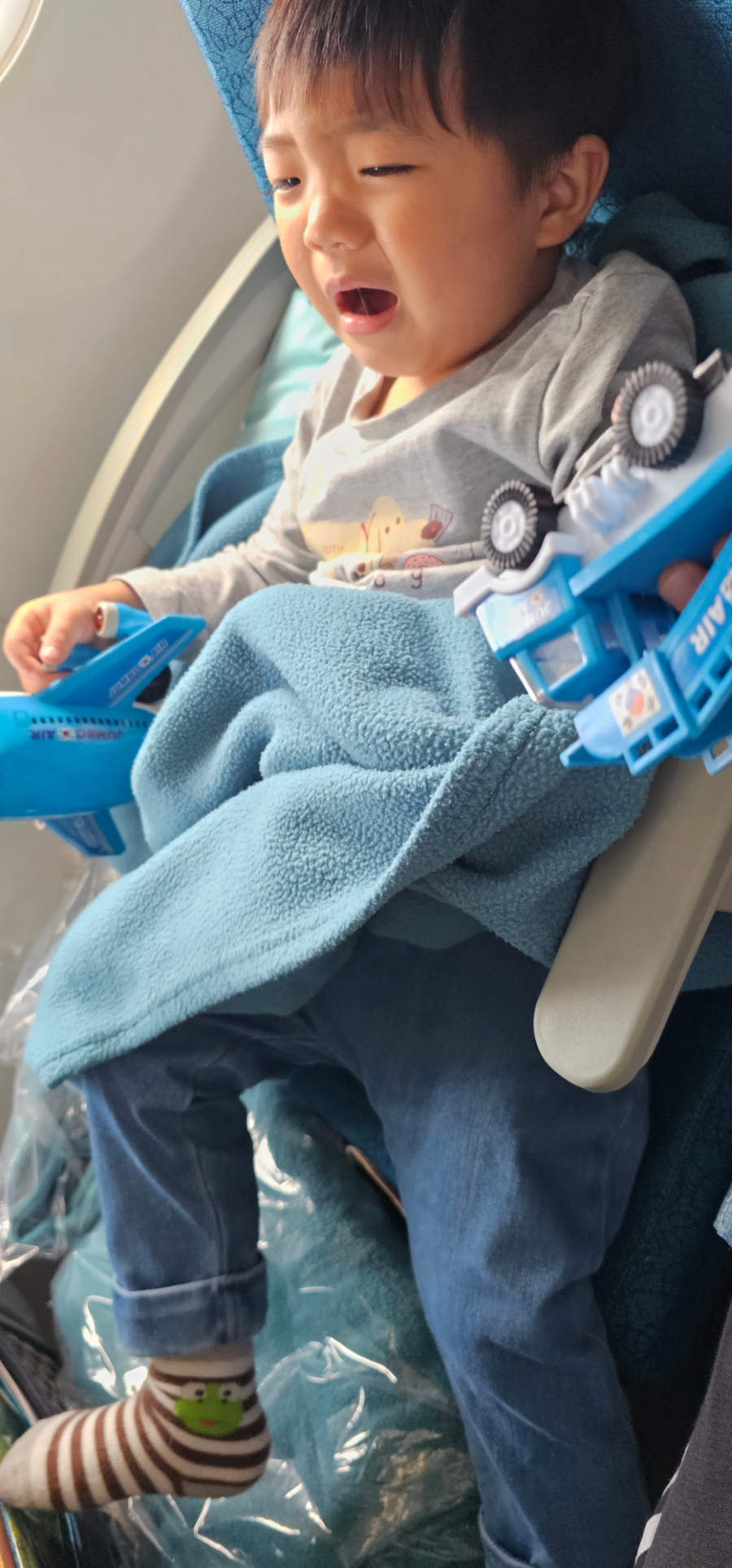 자기 자리에 앉아서 잘 노는 듯 하더니!! 졸려서 그런지 짜증이 ㅋㅋ 비행기 이륙 후라 안아줬더니 금방 잠들었다.