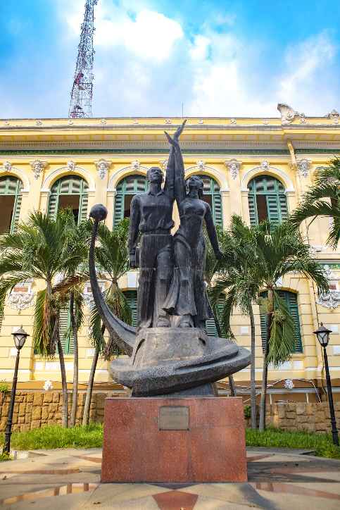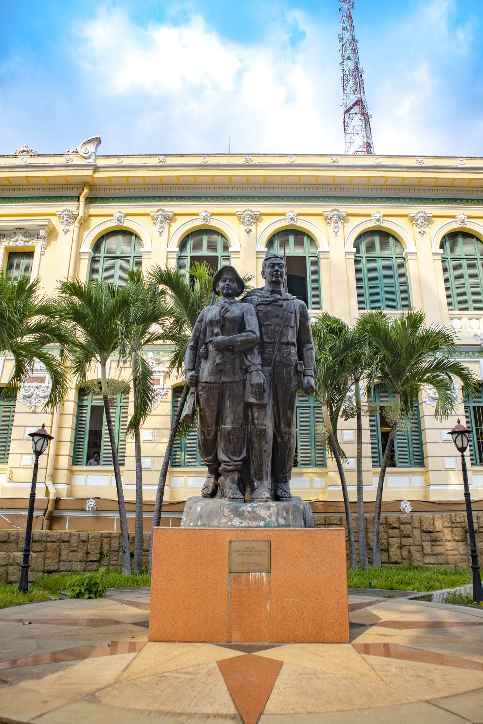 호치민 여행 추천 호치민 중앙우체국 바깥 볼거리는 정문 위에 있는 대형 시계와 정문 양옆으로 베트남군(베트콩)과 베트남 인민을 상징하는듯한 동상이 있습니다.