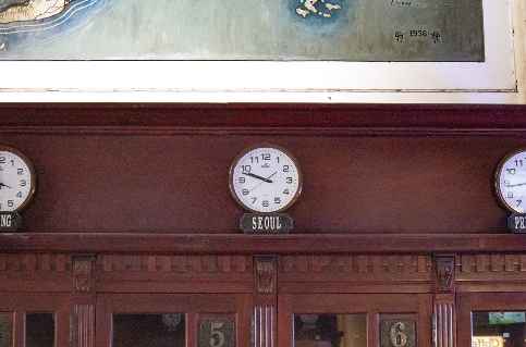 입구 쪽 양옆에는 건축 당시 존재하던 모습을 그대로 간직하고 있는 전화 부스와 그 위에 캄보디아까지 이어지는 전신망 지도가 있었어요. 전화 부스 위쪽에는 우호 국가들의 현지 시각을 알려주는 시계들이 걸려 있었는데 대한민국 서울도 걸려 있어 반가웠었어요.