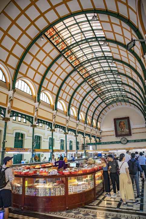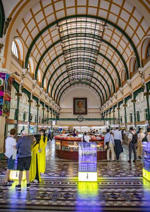 호치민 가볼만한곳 호치민 중앙우체국 내부로 입장해 보았는데요, 내부 역시 바깥과 마찬가지로 인증샷을 찍기 위한 관광객들로 상당히 북적이는 모습이었어요. 실내에는 높은 아치형 천장과 타일 바닥이 마치 유럽의 어느 기차역에 온 듯한 느낌을 주었고, 공산국가에서 흔히 볼 수 있는 호치민 대형 사진 등의 볼거리들이 있었어요.
