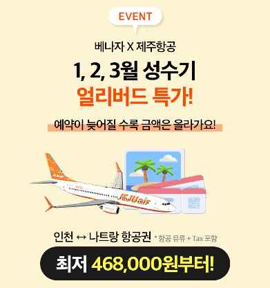 안 그래도 이번 나트랑 여행하며 만족도가 매우 높았기 때문에 조만간 재방문 계획을 세우는 중이었거든요. 가장 먼저 나트랑 항공권부터 알아보는데 마침 베나자에서 프로모션 진행 중이길래 딱 이거다 싶었죠.