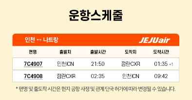 나트랑 항공권 예약하기 전에 운항 스케줄 확인하는 것도 필수랍니다. 출발 시간과 도착 시간을 정확하게 체크해야 다른 일정 짜는 것도 수월해지거든요. 그러나 연착의 가능성도 염두에 두고 일정을 계획하는 것도 중요하니 나짱 항공권 예약할 때 참고해 주세요.